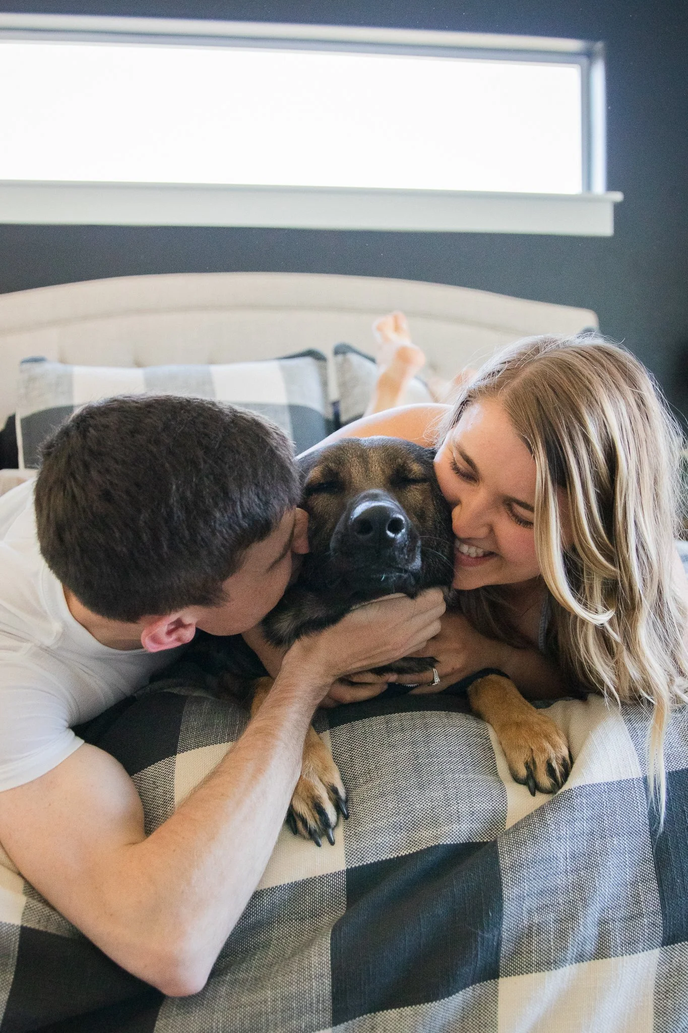 Is it important to you to incorporate your pet into your family photos? Because same! Kyla and Ryn were SO excited to capture some photos with their German Shepherd, Schatzi, during their in-home session. Their sweet pup has some of the most energy I have ever seen in a dog before. Kyla and I were joking the whole session that when it was time to get Schatzi in some of these pictures it was going to be a nightmare because there was no way she was going to sit still. Well, the joke was on us! The moment we incorporated Schatzi into the pictures, she was a perfect angel. It was almost like she knew her photo was being taken and she wanted to show off for the camera. How freaking cute is she?! I can imagine that being in the comfort of her home, without any outside distractions, allowed Schatzi to be her relaxed self.